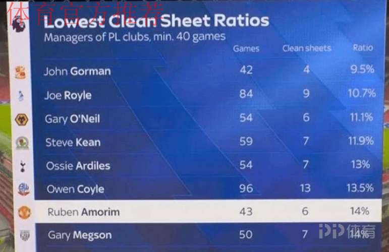 英超“零封率最低”教练榜:阿莫林43场6零封,14%历史第7低
